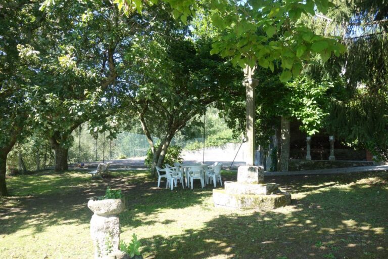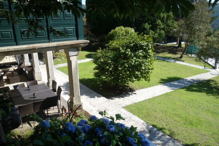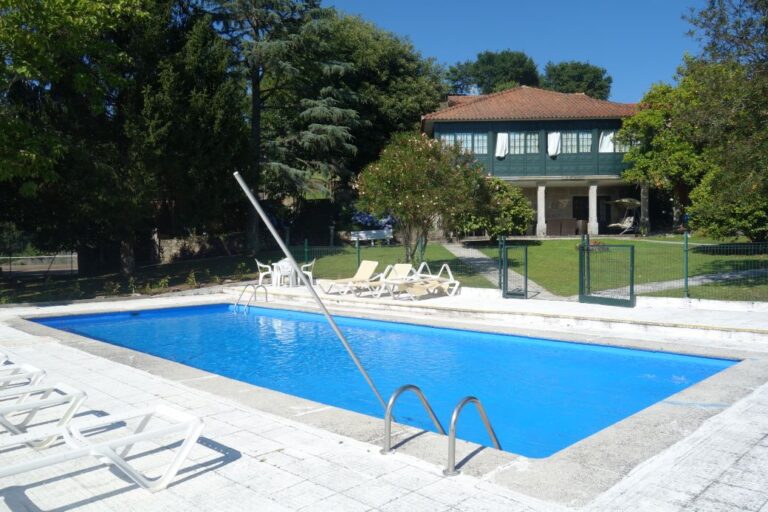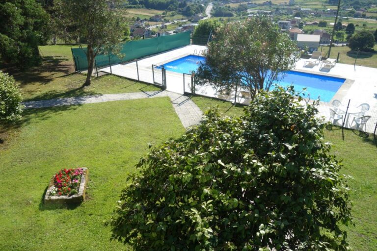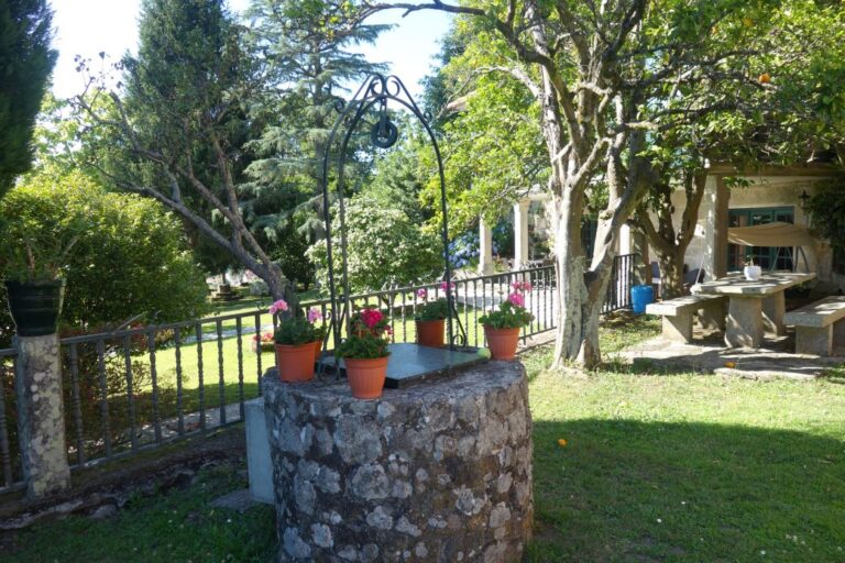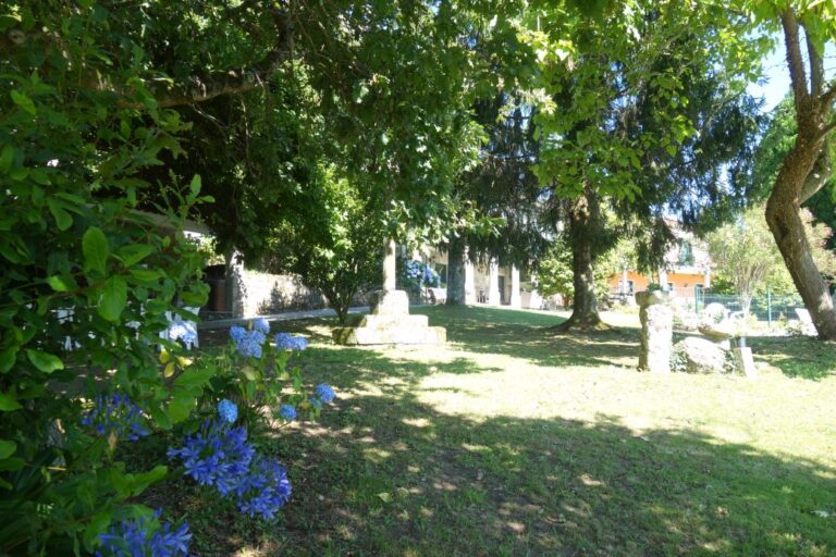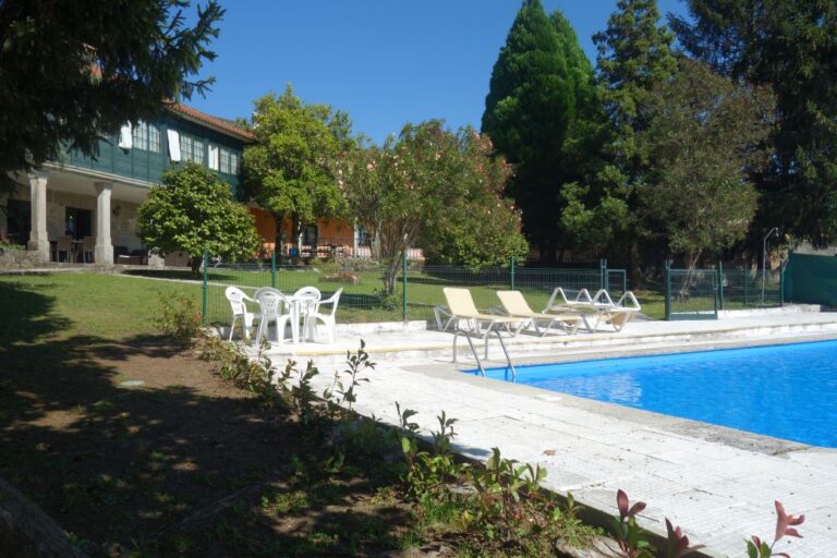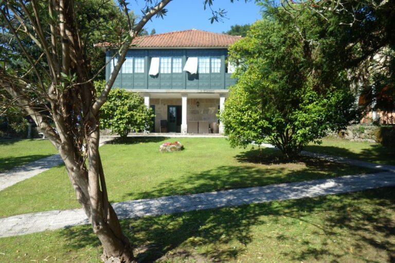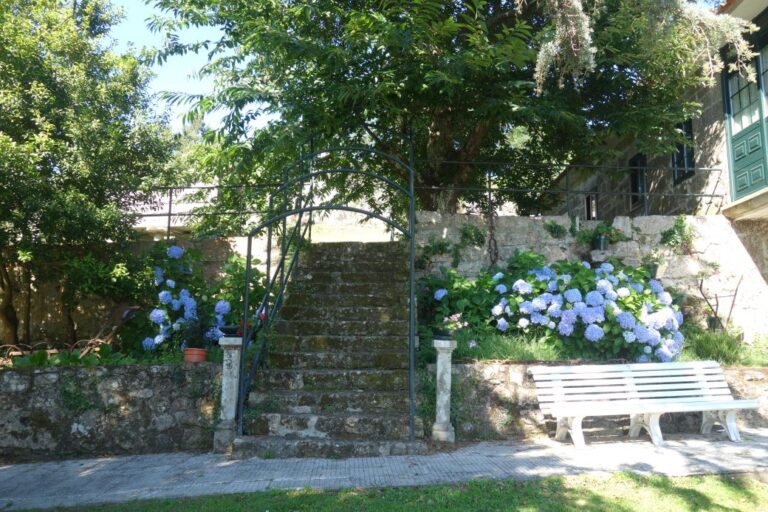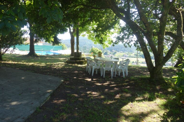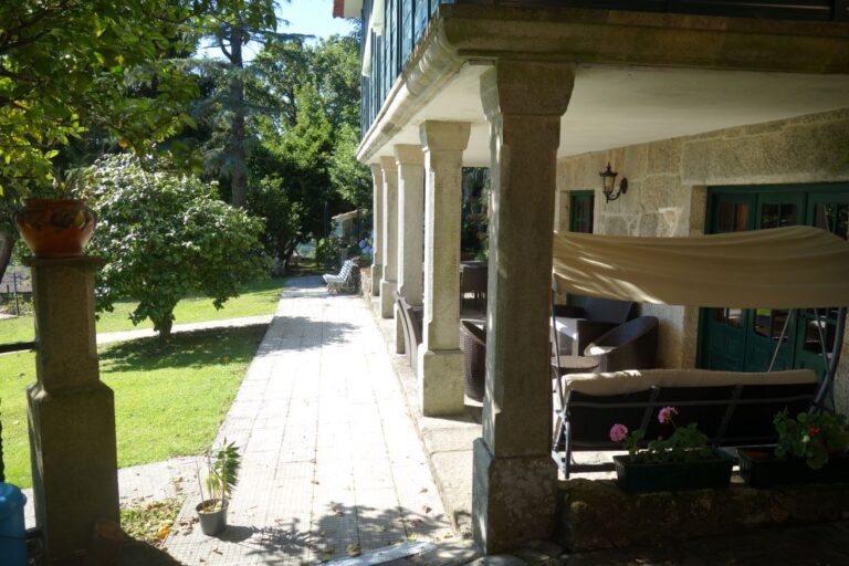 Desde el primer momento que ponemos los pies en la propiedad sentimos y apreciamos el cuidado esmerado de la misma, sus jardines plagados de árboles y plantas ornamentales nos invitan al descanso y el relax. La zona de la piscina y un hermoso porche de piedra, son dos zonas donde podremos disfrutar las las largas tardes de verano y de las impresionantes puestas del sol, apreciando al fondo parte de la isla de Tambo en la Ría de Pontevedra.