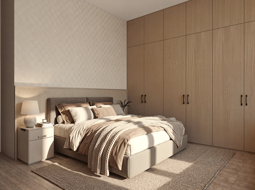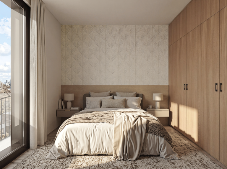 Armarios empotrados forrados y divididos con puertas lacadas en blanco.