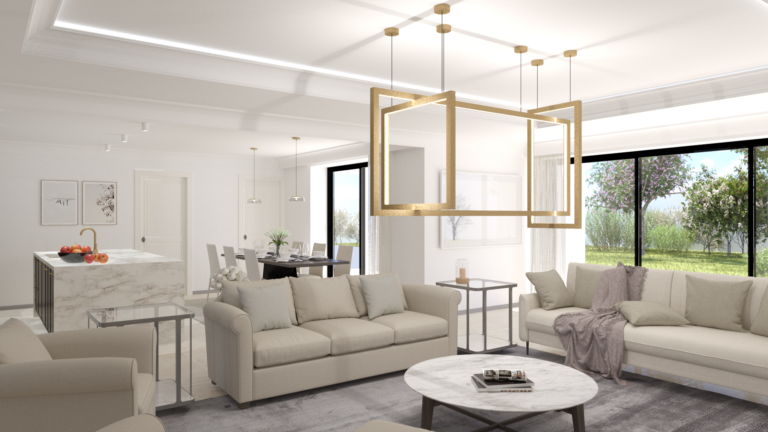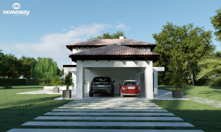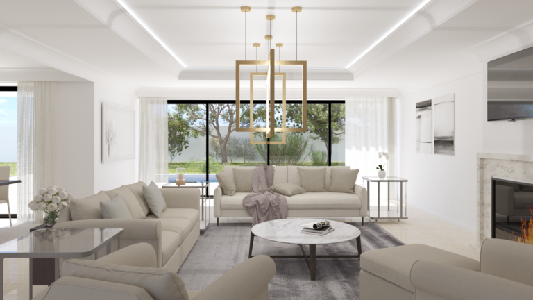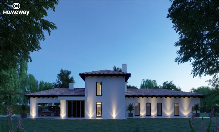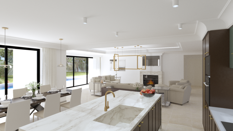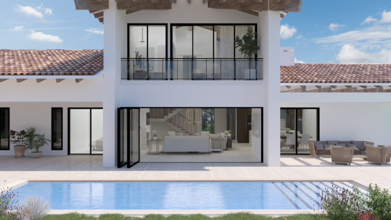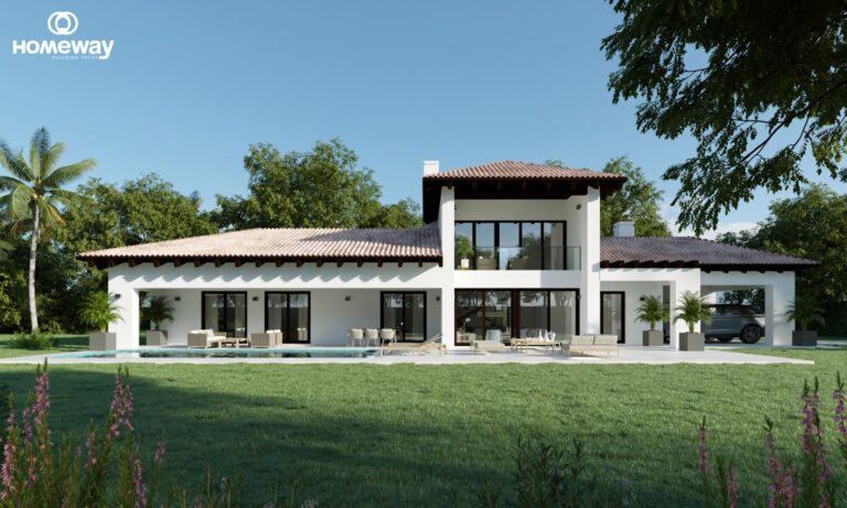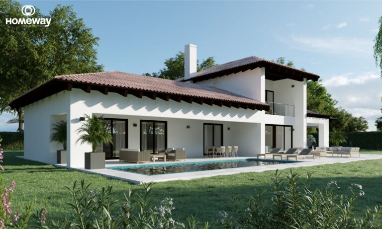 Esta estilosa casa combina a la perfección la arquitectura tradicional con un interior moderno donde los grandes espacios están bañados por la luz natural que se filtra a través de sus grandes ventanales que a su vez hacen de conexión el interior de la misma con el espectacular porche y sus jardines.